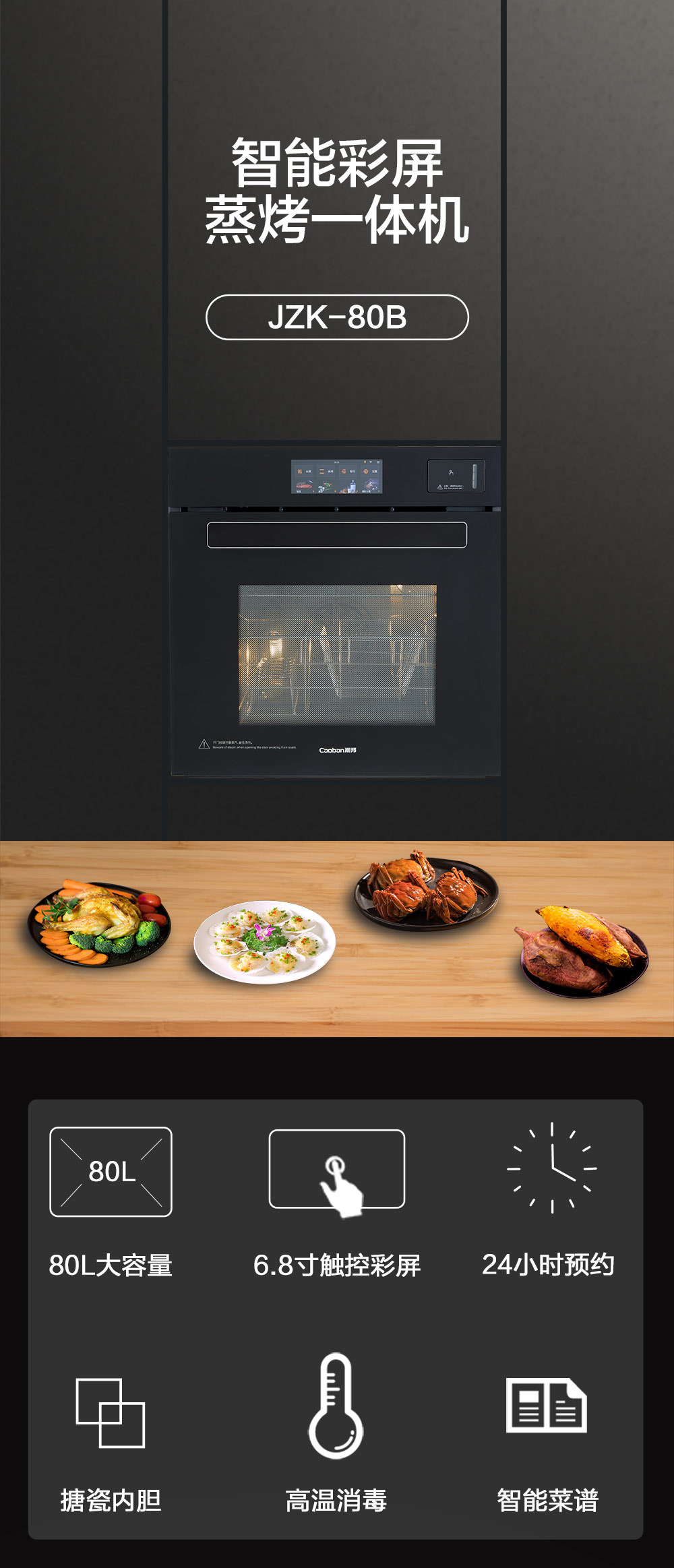 80L大容量;搪瓷內膽;高溫消毒;6 8寸觸控彩屏;