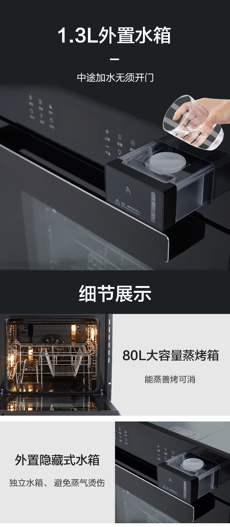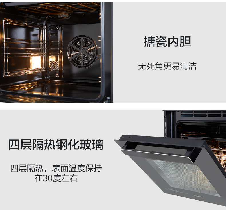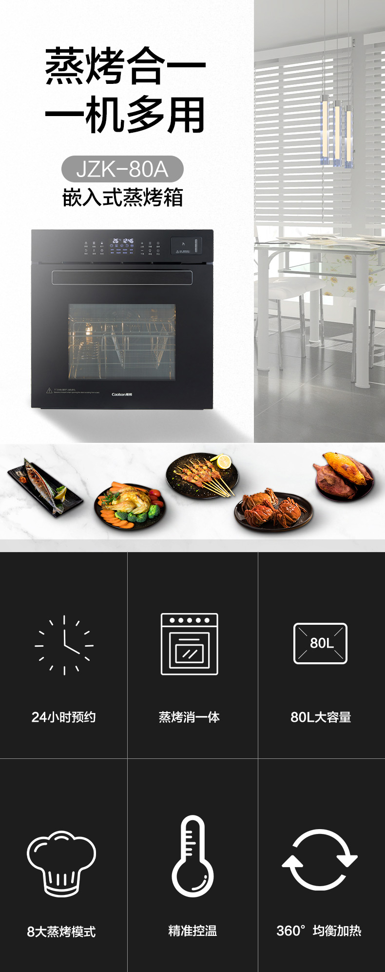 蒸烤消一體;360°均衡加熱,精準控溫;80L大容量;