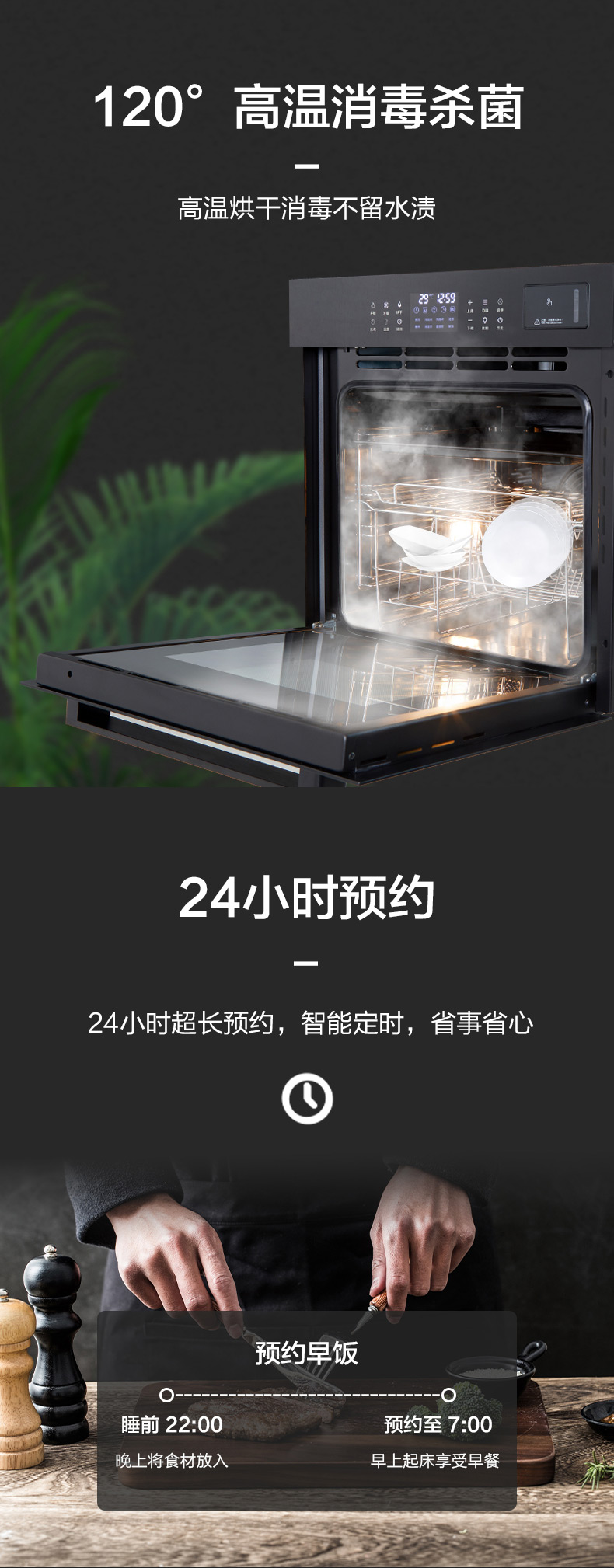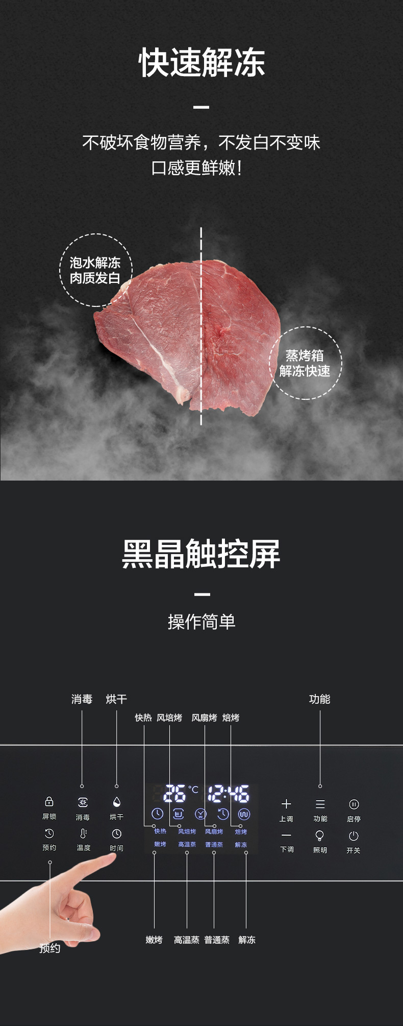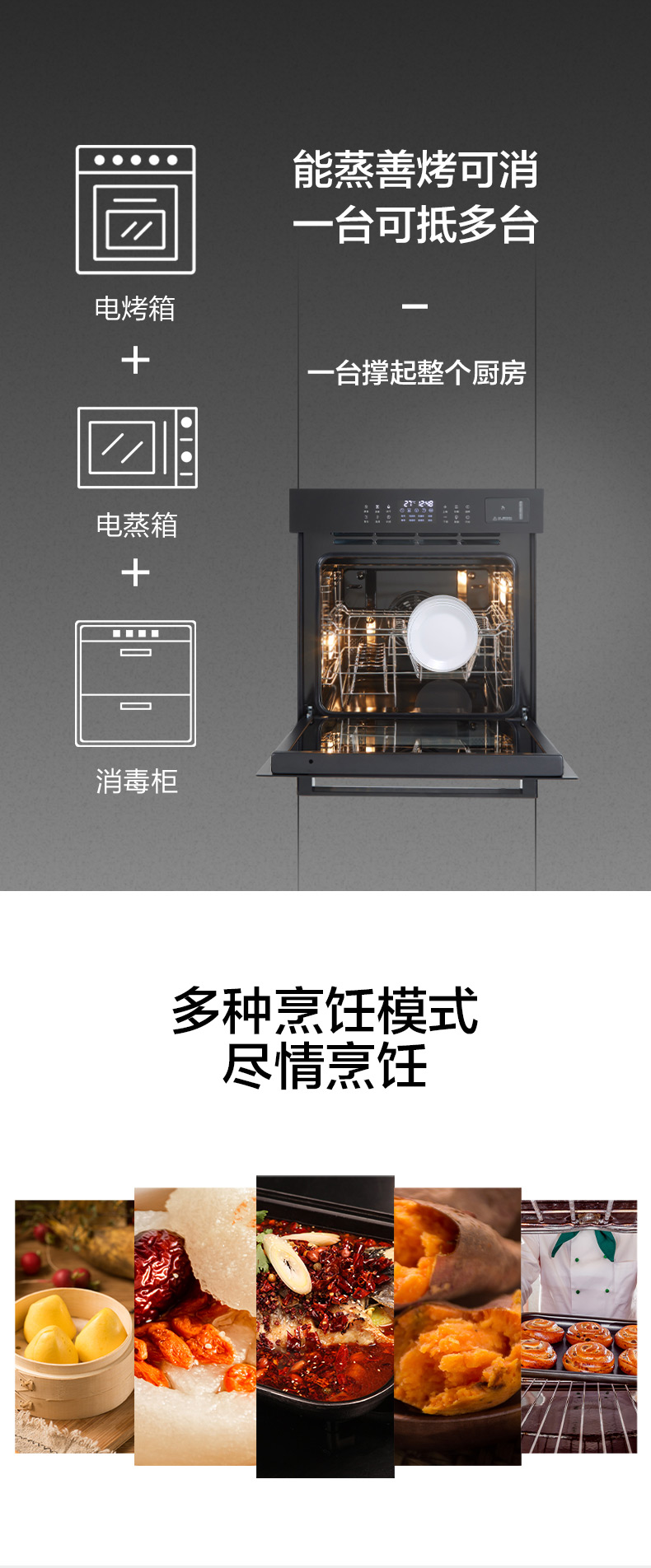 蒸烤消一體;360°均衡加熱,精準控溫;80L大容量;